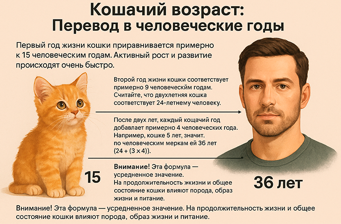 Внимание! Эта формула — усредненное значение. На продолжительность жизни и общее состояние кошки влияют порода, образ жизни и питание.